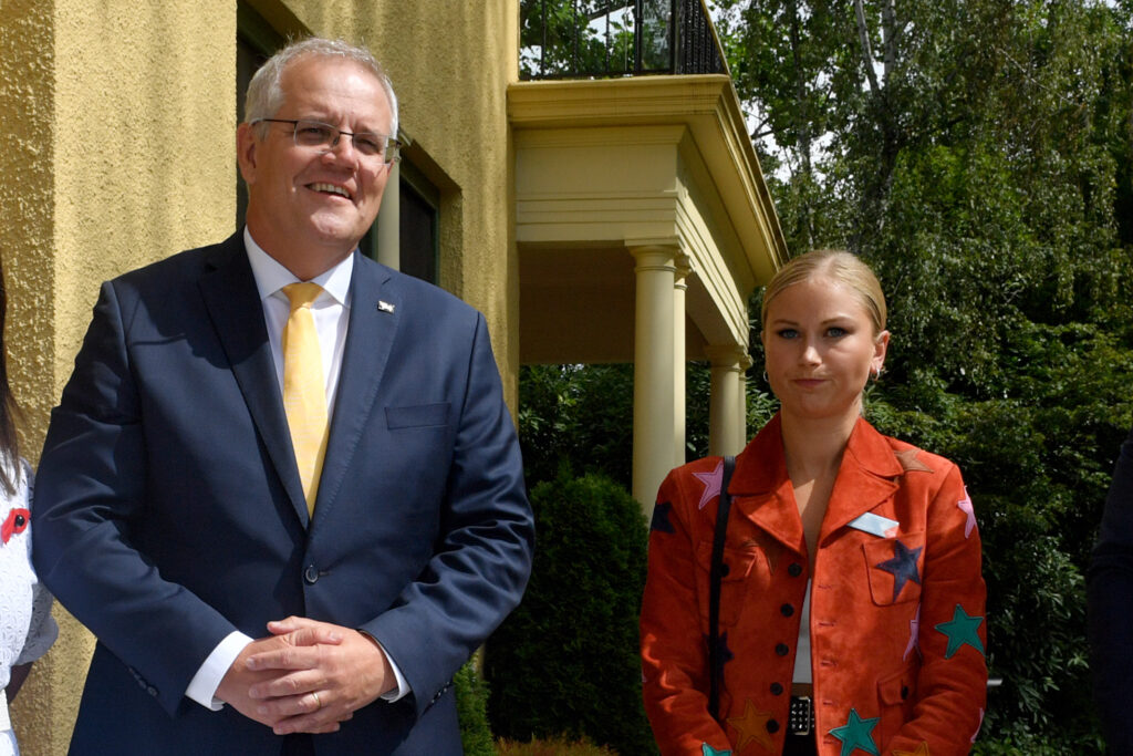 Prime Minister Scott Morrison and 2021 Australian of the Year Grace Tame during a morning tea for state and territory recipients in the 2022 Australian of the Year Awards at The Lodge in Canberra, Tuesday, January 25, 2022. (AAP Image/Mick Tsikas)