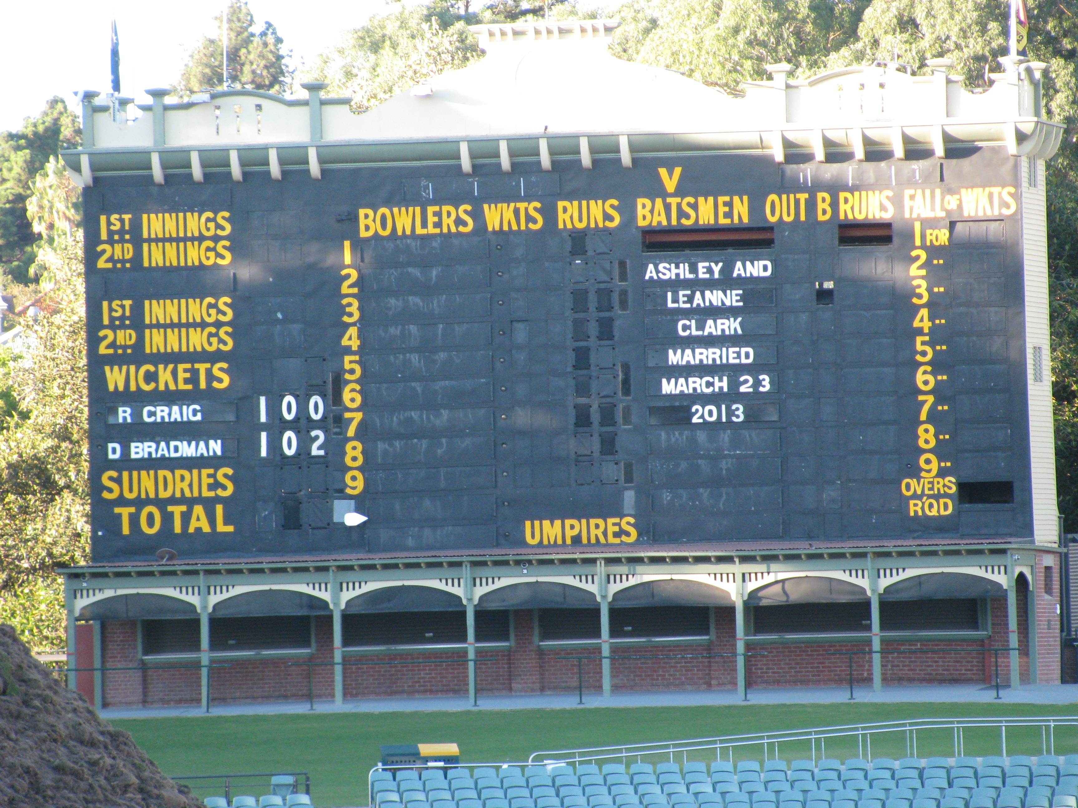THE SCOREBOARD AT ADELAIDE OVAL SHOWING DON BRADMANS AND BKS DADS SCORES FROM THE 1947 SA,vINDIA GAME.